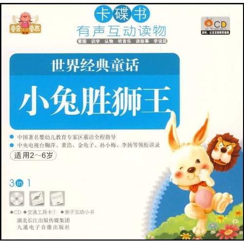 《世界经典童话小兔胜狮王》适用2~6岁,中国著名婴幼儿教育专家区慕洁全程指导,中央电视台鞠萍、董浩、金龟子、孙小梅、李扬等领衔讲录。有声互动读物,让您的宝宝看图,识字,认物,听音乐,讲故事,学说话、视觉、听觉、动作、多感官协调发展。
