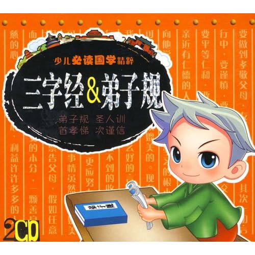 《三字经&弟子规》三字经虽然不长,分量却不轻。可以说,是一本儿童启蒙“宝书”,是一册论论述人生哲学、倡建和谐社会、弘扬中华文化的典粹,相信孩子们读后会有所感悟。《弟子规》是一本好教材。它的语言浅显凝炼,注重合折押韵,读来朗朗上口,易于记诵。内容上从儿童的日常坐卧行止而施行教化,体现出趣味性和使孩子们易于接受。