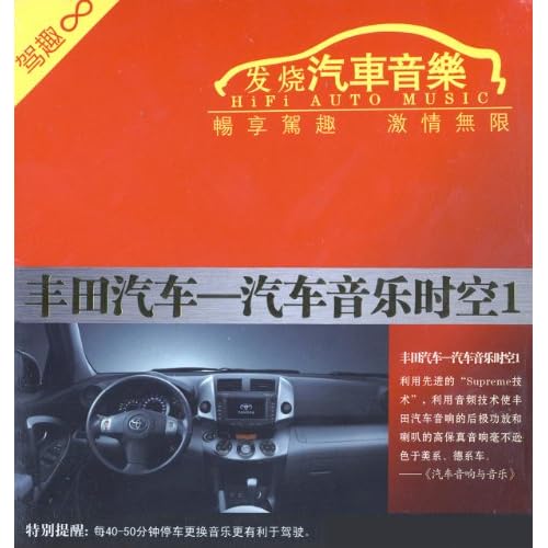 《丰田汽车:汽车音乐时空》这张完全针对丰田汽车音响的汽车音乐极力从音频技术上弥补这一缺憾。空旷高远的苏格兰风情《旅程》缓缓拉开序幕,更有莎拉布莱曼的世界名曲《Time to say goodbye》改编版本,最后以强劲的《体验动感》结束,采用了世界最先进的“Supreme技术”,自动修正16KHz之外的波形弥补部分音质损失,添加最高达44KHz的音频,最佳的数码音质效果,尽在《汽车音乐时空》。