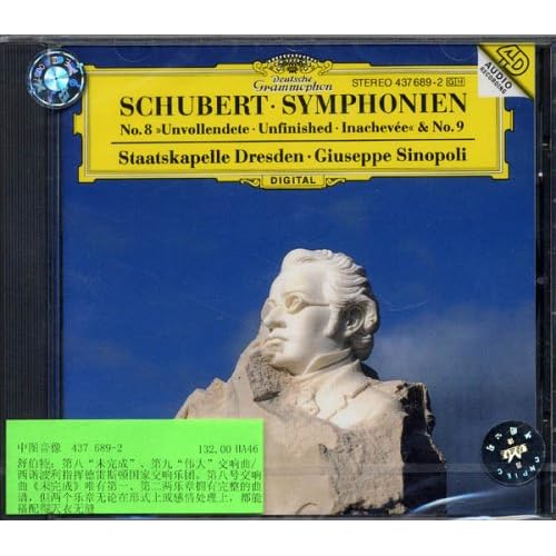 舒伯特:第八“未完成”、第九“伟大”交响曲/西诺波利指挥德雷斯顿国家交响乐团。第八号交响曲《未完成》唯有第一、第二两乐章拥有完整的曲谱,但两个乐章无论在形式上或感情处理上,都能搭配得天衣无缝