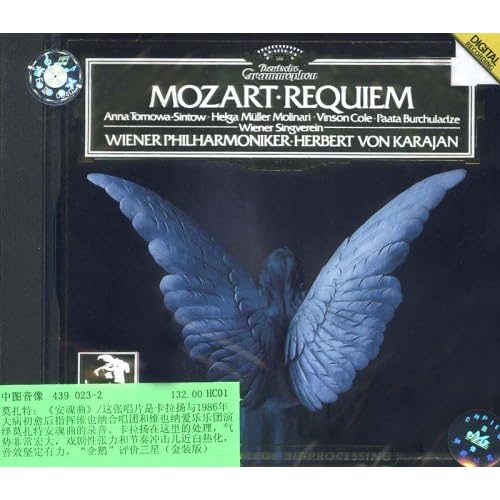 《莫扎特-安魂曲,托莫娃·新托演唱》是卡拉扬指挥维也纳爱乐乐团,这张唱片是卡拉扬的1986年大病初愈后指挥维也纳合唱团和维也纳爱乐乐团演绎莫扎特安魂曲的录音。这个金装版是数字录音,规模宏大,“企鹅”评价三星。